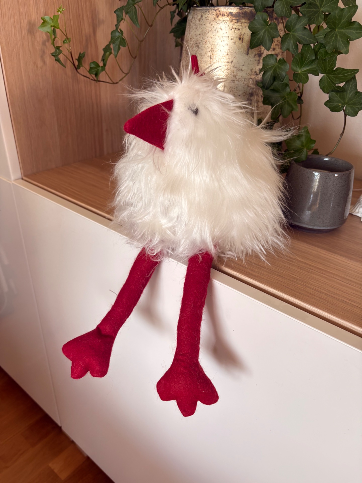Lurvig höna fylld med polyestervadd.Barnsäkra ögon.VitHandsydd av Pernilla Vågar inte rekommendera tvätt.