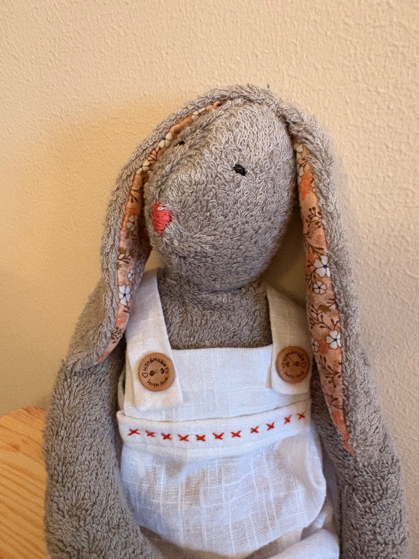 Här har ni Kajsa som är sydd i en dubbelvävd frotté. Armar och ben är väl fastsydda och inte rörliga. Öronen är fodrade med ett blommigt orange tyg.