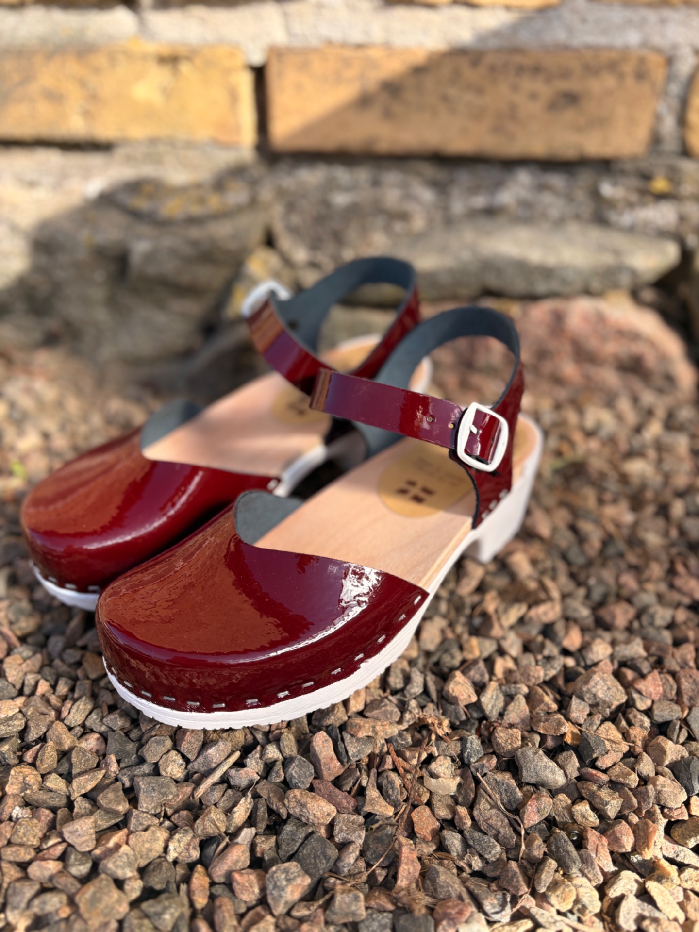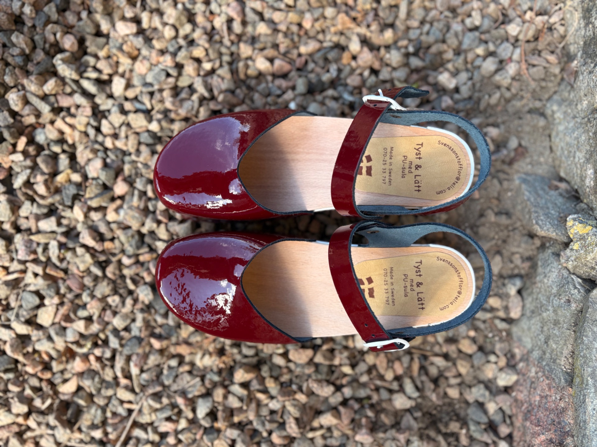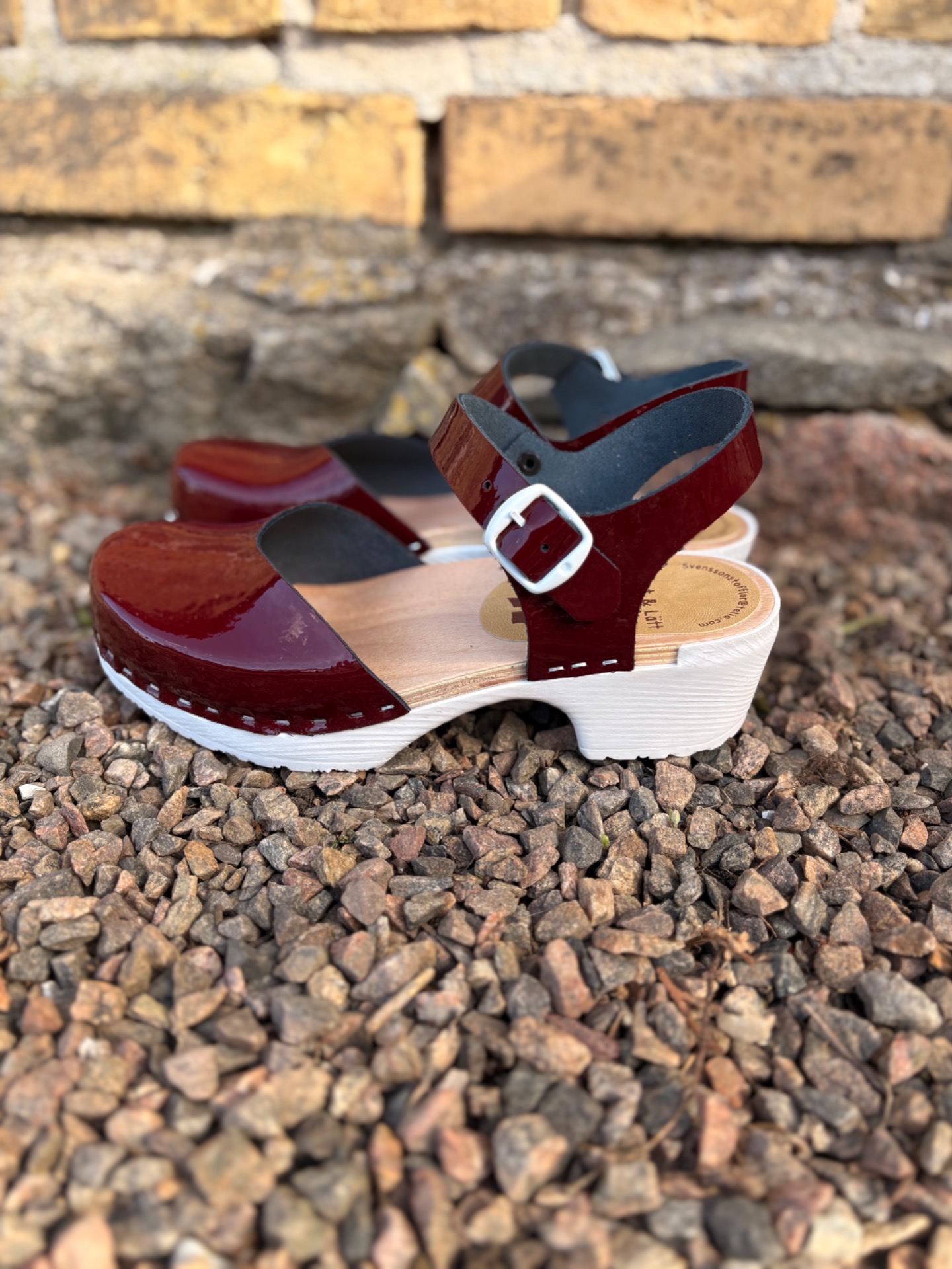Här är en toffel med stil. Den har en sula med tyst o lätt botten i vitt samt ett vinrött skinn i lackad finnish.